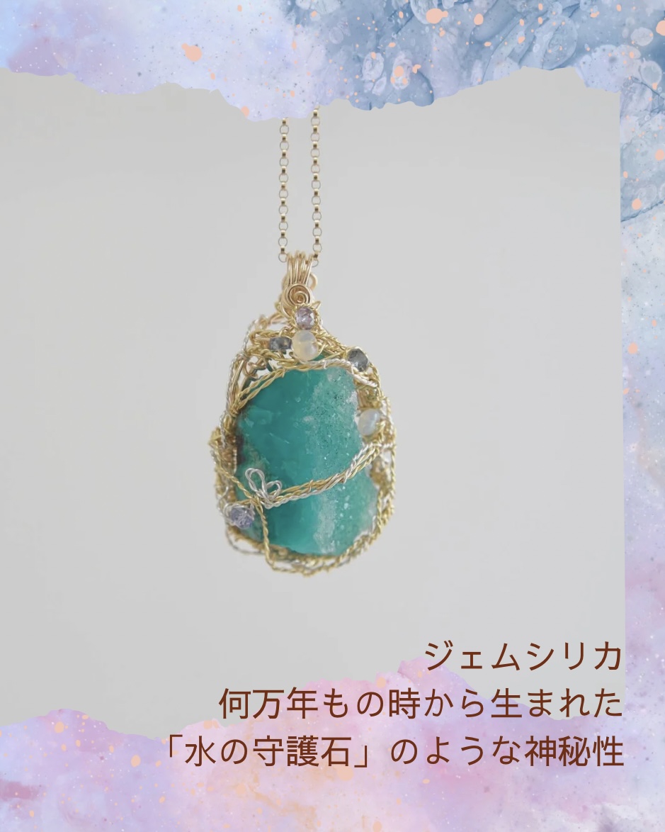 地球が何万年もかけて描いたジェムシリカのグラデーション。 その一瞬の美しさを、水の流れを描くように ゴールドのワイヤーで優しく包み込みました。